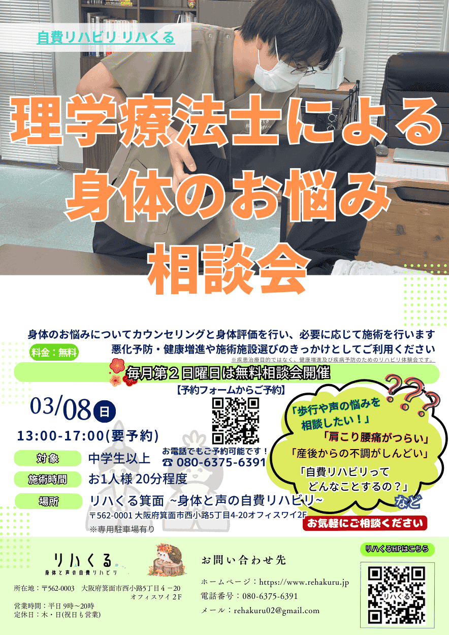 3月の身体のお悩み相談会は第2週日曜の8日に開催いたします。詳細はこちらから▶︎チラシを確認